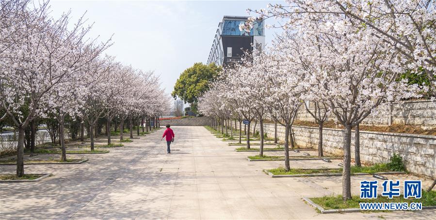 3月19日,在武漢市武昌區(qū)被網(wǎng)友稱為“武漢最美停車場(chǎng)”的湖北日?qǐng)?bào)停車場(chǎng),一名工作人員從櫻花樹邊經(jīng)過。  新華社記者 才揚(yáng) 攝