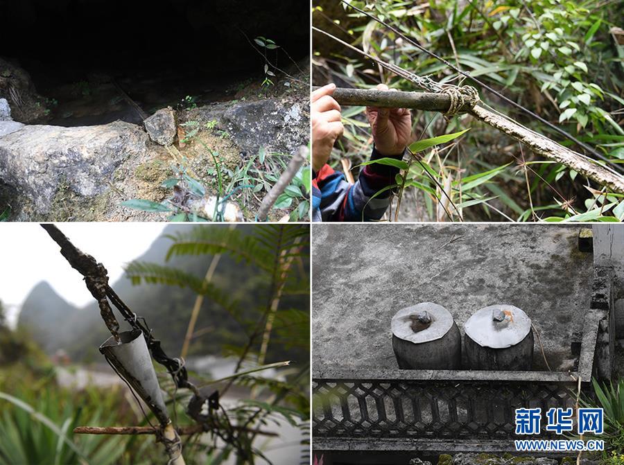 這張拼版圖片顯示廣西都安瑤族自治縣澄江鎮(zhèn)自成村加倫屯村民黃景飛獨創(chuàng)的“鐵線引水”法(2018年3月16日攝)。左上圖為竹枧將山泉水從山洞引出;右上圖為竹枧將山泉水引到鐵線上;左下圖為一個特制的漏斗將水接入膠管里;右下圖為膠管將山泉水送到水缸里。廣西有近一半貧困人口生活在石漠化地區(qū),涉及數(shù)十個縣區(qū)。這里也是廣西飲水保障程度最低的地區(qū),解決貧困人口飲水問題是廣西脫貧攻堅戰(zhàn)“硬仗中的硬仗”?!笆濉币詠?,廣西加快實施農(nóng)村飲水安全鞏固提升工程。因地制宜,采取新建、擴建及管網(wǎng)延伸等多種措施,補齊貧困地區(qū)水利薄弱短板,進一步提升石漠化地區(qū)群眾飲水安全保障水平,助推脫貧攻堅。新華社記者陸波岸攝