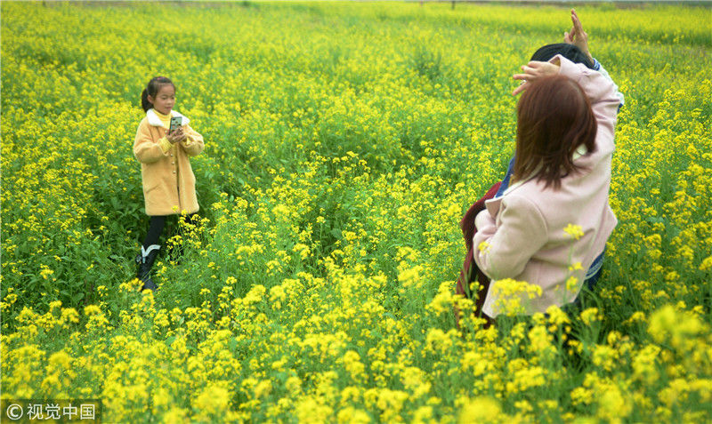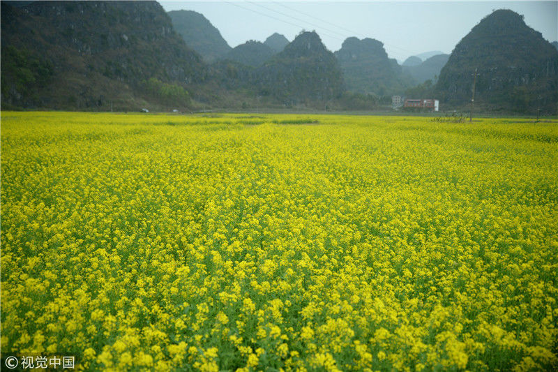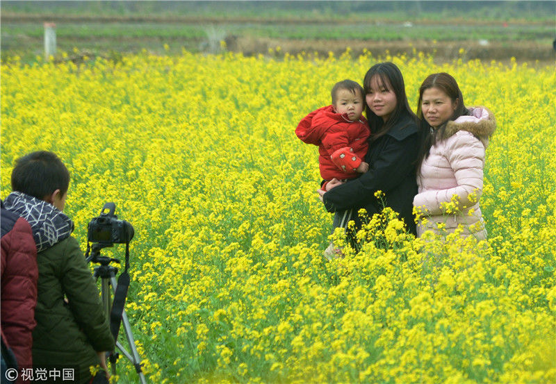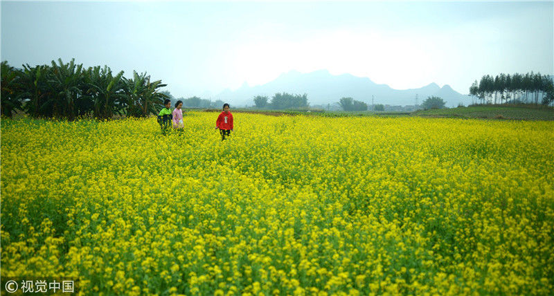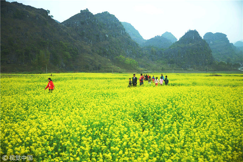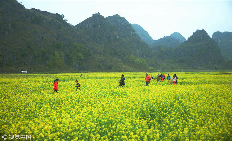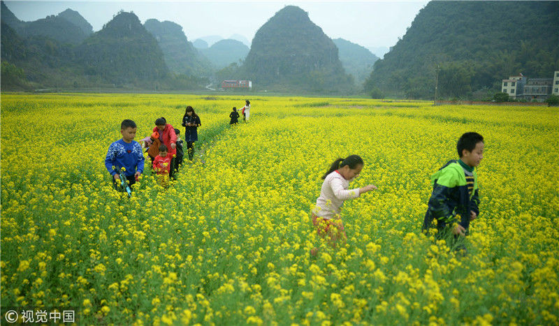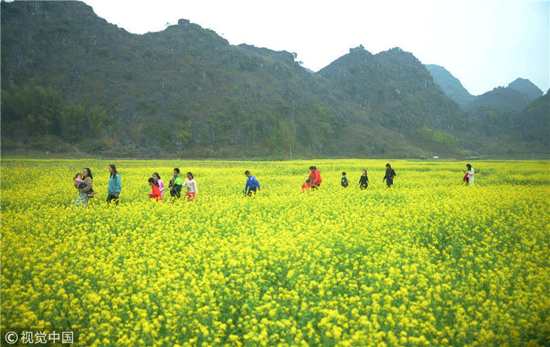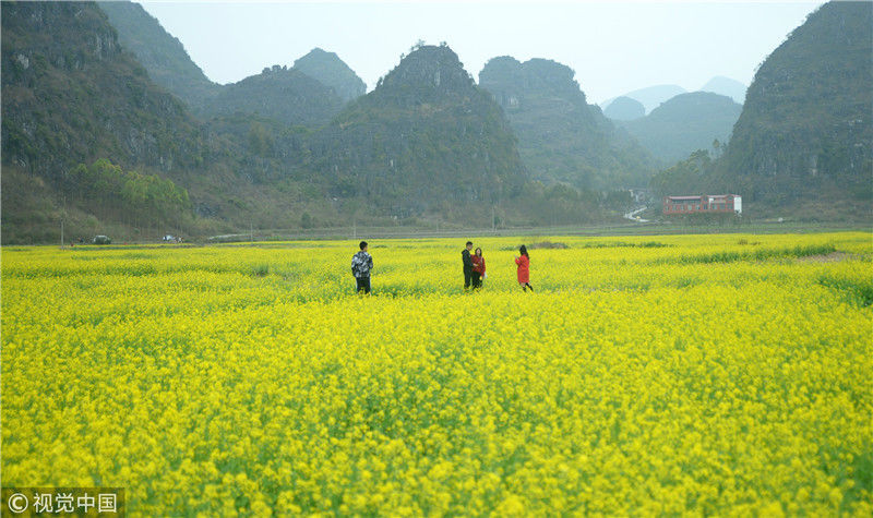 2019年2月5日,春節(jié)期間,廣西來賓市忻城縣萬余畝油菜花競相綻放,吸引眾多游客前來賞花游玩,感受春天的氣息。近年來,廣西忻城縣大力實施鄉(xiāng)村振興戰(zhàn)略,注重發(fā)展鄉(xiāng)村旅游產(chǎn)業(yè),把鄉(xiāng)村旅游與美麗鄉(xiāng)村、脫貧攻堅緊密結(jié)合起來,輻射帶動當(dāng)?shù)刎毨裘撠氈赂?。樊紹光/視覺中國