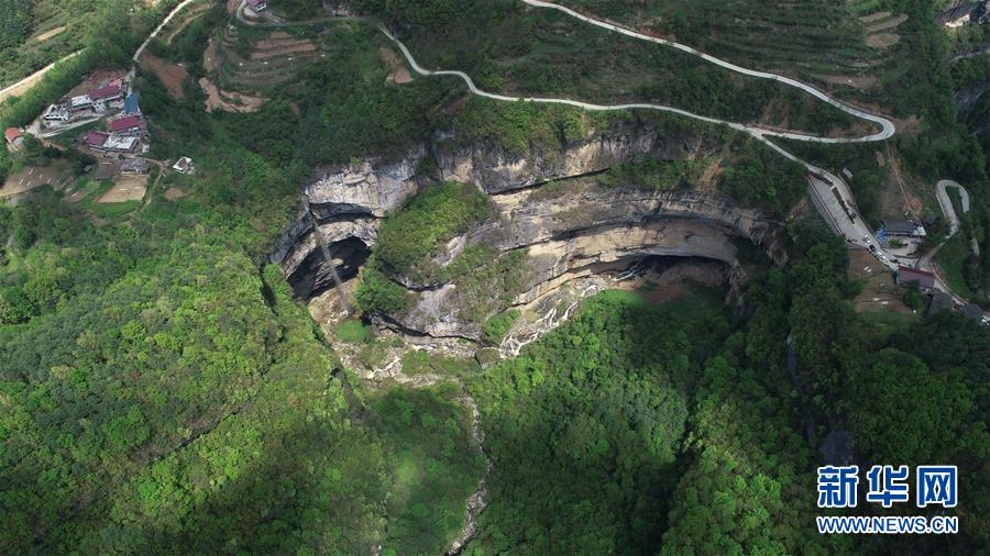 這是在陜西省漢中市寧強縣火石子村用無人機拍攝的地洞河天坑。新華社張博文攝