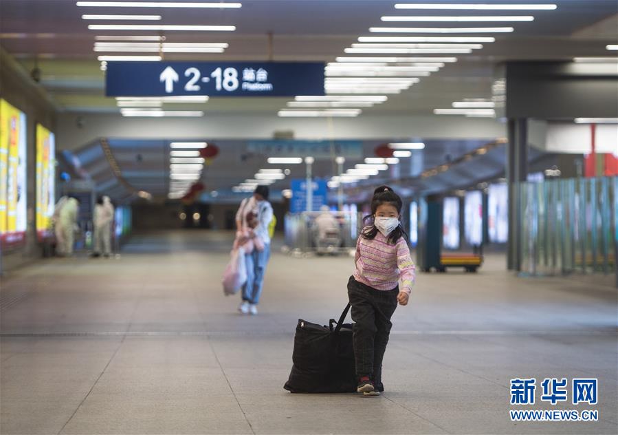 3月28日,在漢口火車站,一名小朋友幫家長提行李出站。新華社記者肖藝九攝
