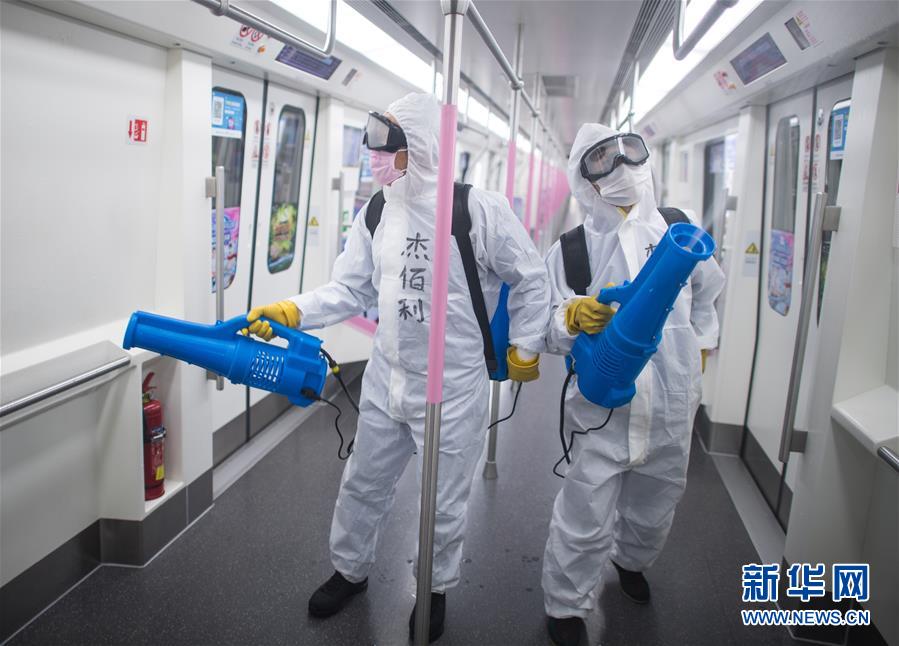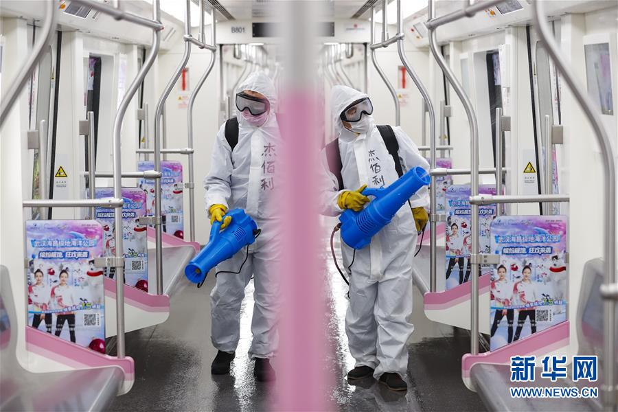 3月23日,在武漢地鐵常青車輛段,保潔人員在消毒。新華社記者肖藝九攝