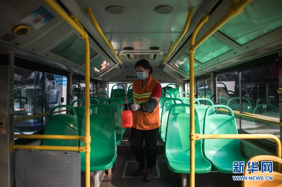 3月23日,在武昌火車站公交車總站,武漢公交集團站務公司保潔員趙真香在為一輛公共汽車消毒清洗。新華社記者肖藝九攝