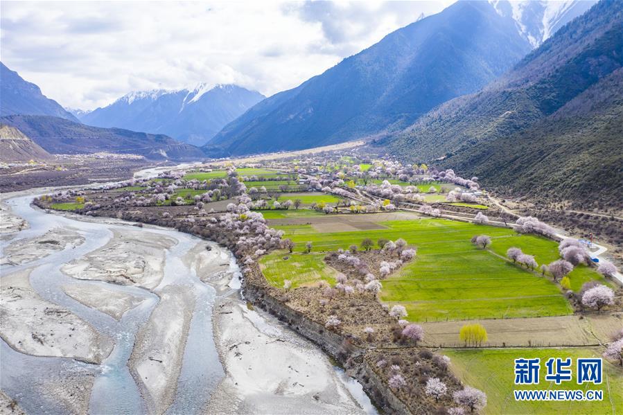 西藏林芝市波密縣境內(nèi)桃花盛開的田園風(fēng)光(無(wú)人機(jī)照片,3月26日攝)。新華社記者 普布扎西 攝