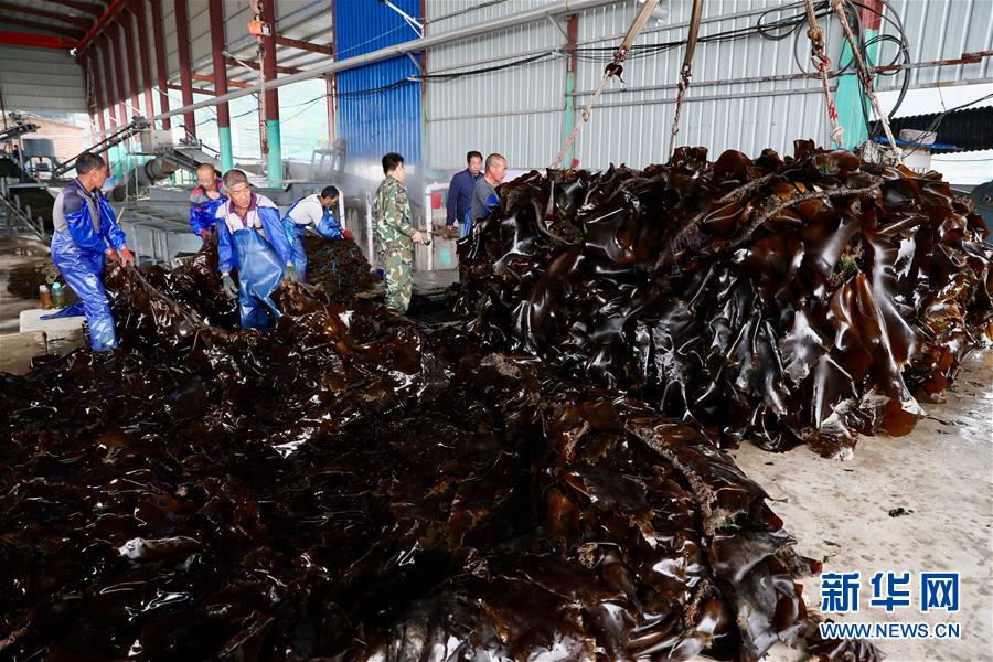 4月10日,霞浦縣長春鎮(zhèn)埕塢村一家海帶加工廠內(nèi),工人在搬運剛收獲的海帶。新華社記者姜克紅攝