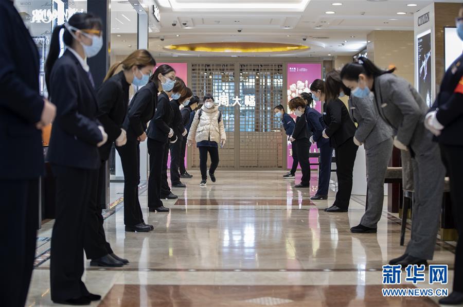 3月30日,在武商世貿(mào)廣場,工作人員歡迎顧客進(jìn)入。當(dāng)日,武漢市多家商場開門迎客。新華社記者費茂華攝