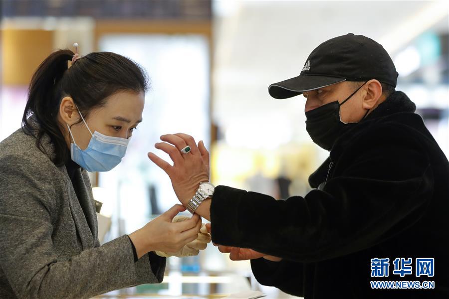 3月30日,在武漢市武商世貿(mào)廣場,一名顧客(右)在挑選手表。當日,武漢市多家商場開門迎客。新華社記者沈伯韓攝