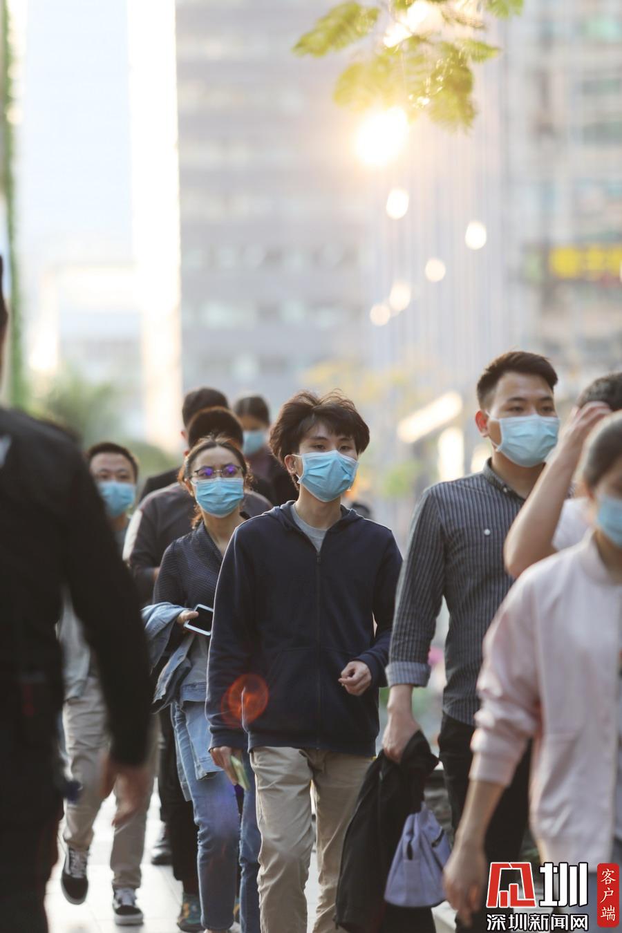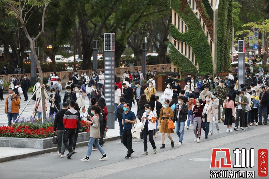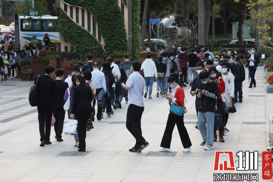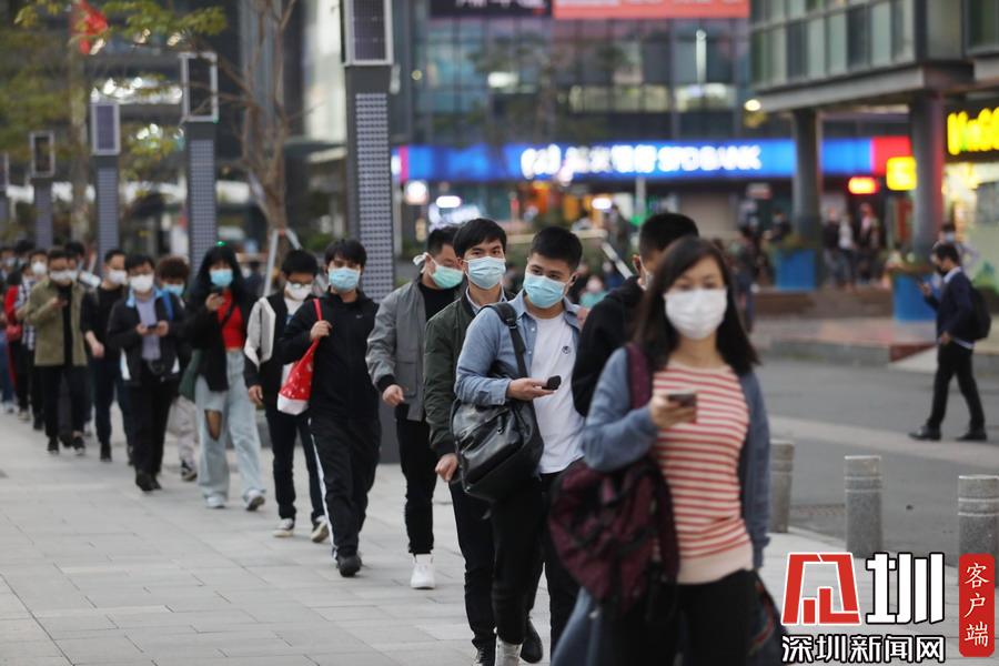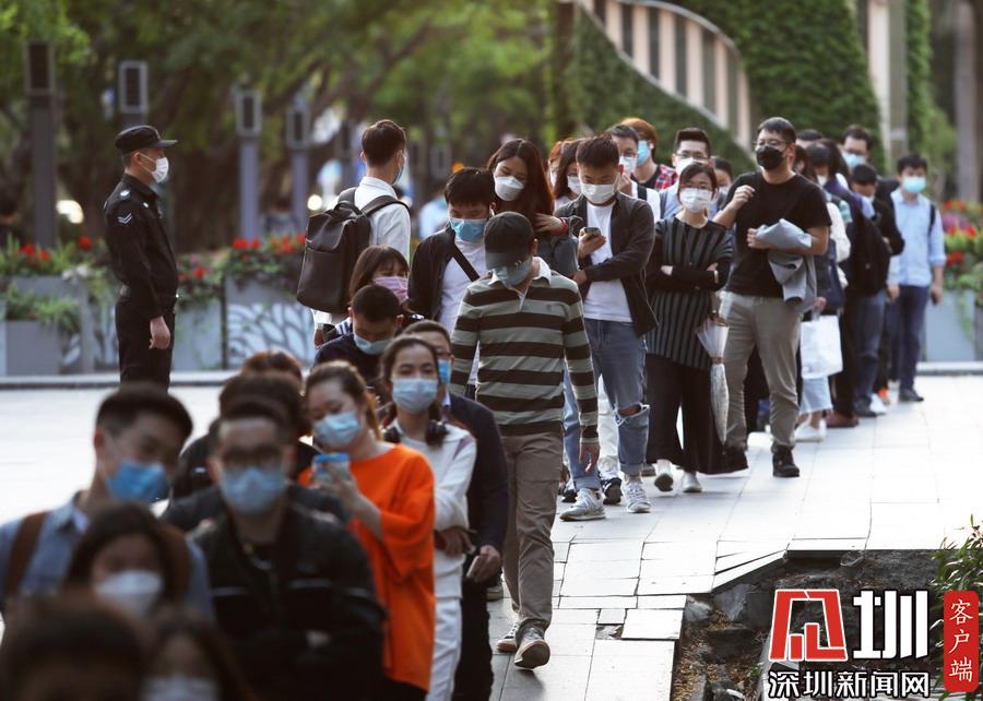 見圳客戶端·深圳新聞網(wǎng)2020年3月19日訊  下班時間,深圳地鐵一號線深大站A3出口外,下班后的市民在站外排大排長龍,依次有序進入地鐵站乘坐列車回家。