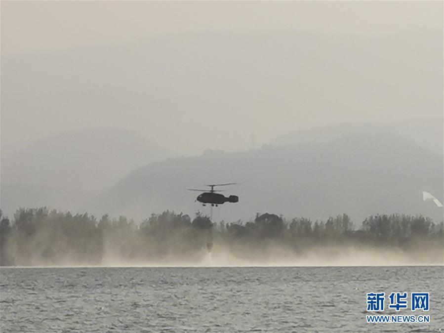 4月1日,一架參與西昌森林火災(zāi)滅火的直升機在邛海中取水(手機拍攝)。新華社記者惠小勇攝