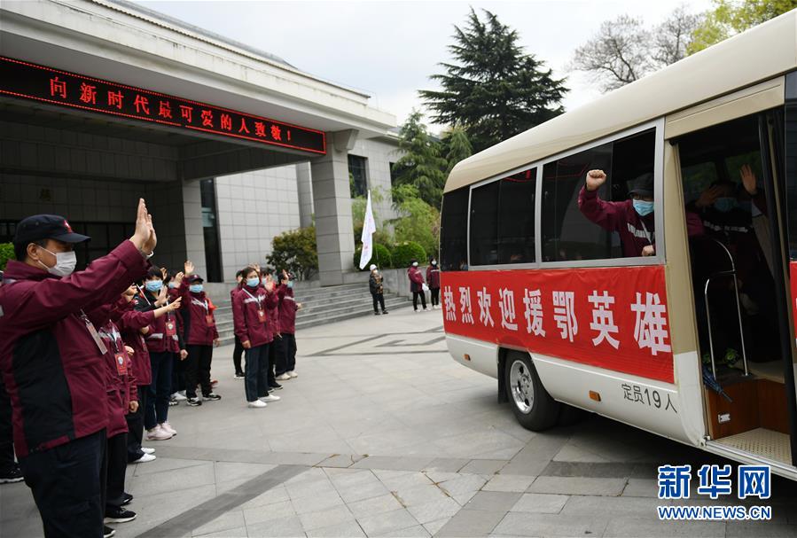 4月3日,乘車踏上歸途的寶雞市三家醫(yī)院的醫(yī)療隊(duì)隊(duì)員與“戰(zhàn)友”告別。 當(dāng)日,陜西省第一批援鄂醫(yī)療隊(duì)137名隊(duì)員在陜西省工人療養(yǎng)院結(jié)束了為期兩周的隔離休養(yǎng)。醫(yī)療隊(duì)員與“戰(zhàn)友”深情作別后,陸續(xù)踏上歸途。 新華社記者 李一博 攝