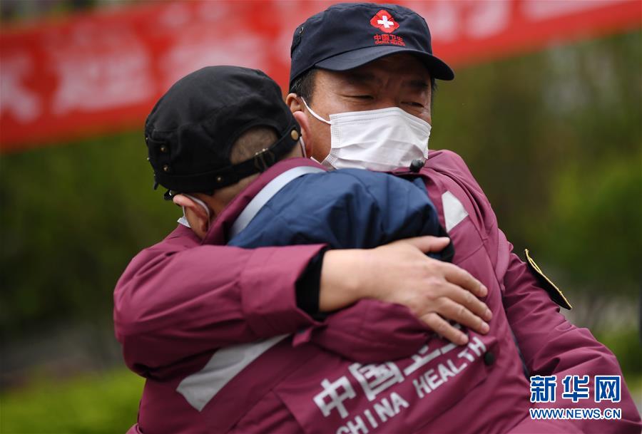 4月3日,陜西醫(yī)療隊(duì)隊(duì)員擁抱告別。 當(dāng)日,陜西省第一批援鄂醫(yī)療隊(duì)137名隊(duì)員在陜西省工人療養(yǎng)院結(jié)束了為期兩周的隔離休養(yǎng)。醫(yī)療隊(duì)員與“戰(zhàn)友”深情作別后,陸續(xù)踏上歸途。 新華社記者 李一博 攝