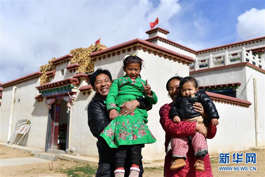 在拉薩市堆龍德慶區(qū)古榮鄉(xiāng)榮瑪高海拔生態(tài)搬遷點(diǎn),尼加(左一)和家人在家門前合影(4月2日攝)。