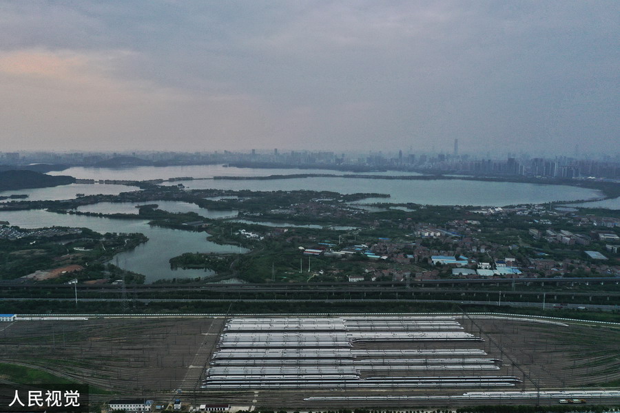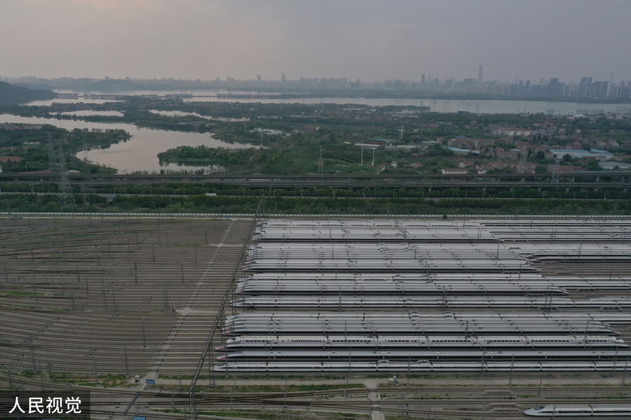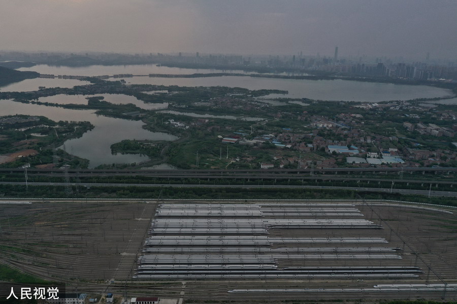 2020年4月6日,武漢動車段高鐵動車組整裝待發(fā)(無人機照片)。