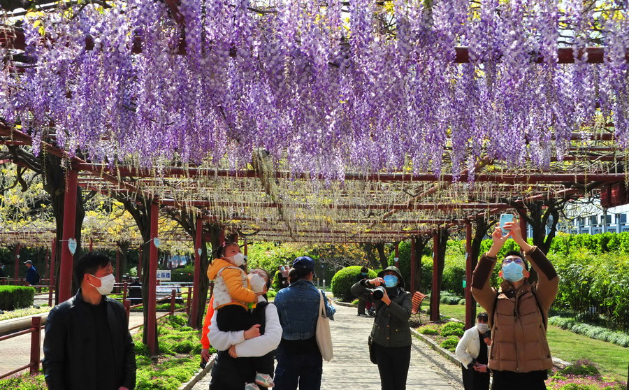 2020年4月5日,上海,每年的4月上旬至5月初是觀賞紫藤花的最佳時期。清明小長假里,晴好天氣使嘉定紫藤園迎來了不少市民游客。今年的紫藤公園采取提前預約和亮相綠色隨申碼的舉措入園賞花。公園擁有26個品種的紫藤花,盛開時期的紫藤花穗最長可達1米多?;ㄉ凶?,粉,白等,形成的花瀑宛若一簾幽夢,雅致春意今人流連忘返。