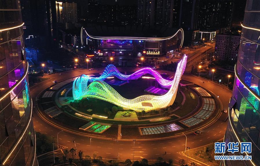 4月7日,武漢光谷環(huán)島開啟燈光秀(無人機照片)。當日,隨著武漢解除離漢通道管控進入倒計時,全市開啟了城市景觀照明,夜色中的武漢美不勝收。新華社記者李賀攝