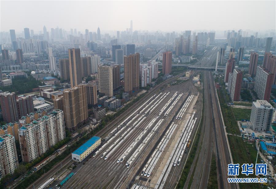 4月7日,在武漢動(dòng)車段,列車??吭诖孳嚲€上(無(wú)人機(jī)照片)。 新華社記者 肖藝九 攝