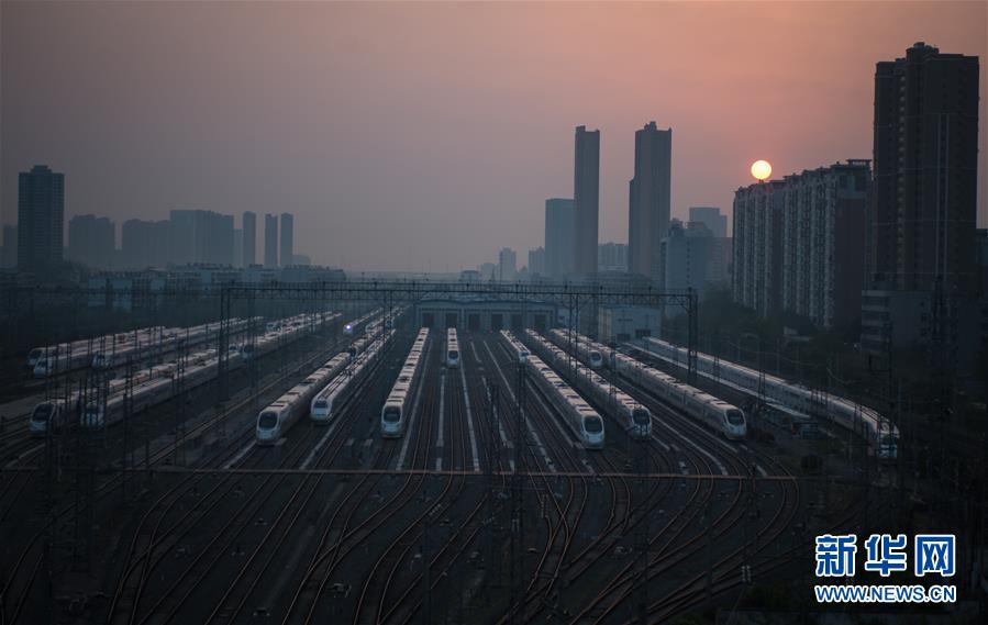 4月8日,在武漢動車段,列車??吭诖孳嚲€上準備投入運行。 新華社記者 肖藝九 攝