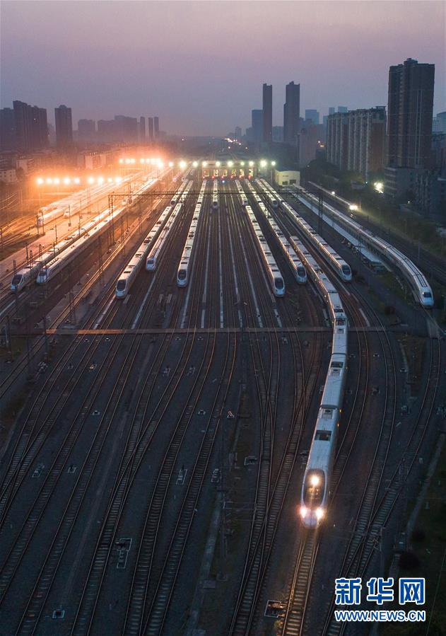 4月8日,一列動車從武漢動車段駛出,開往漢口站迎接旅客(無人機照片)。 新華社記者 肖藝九 攝