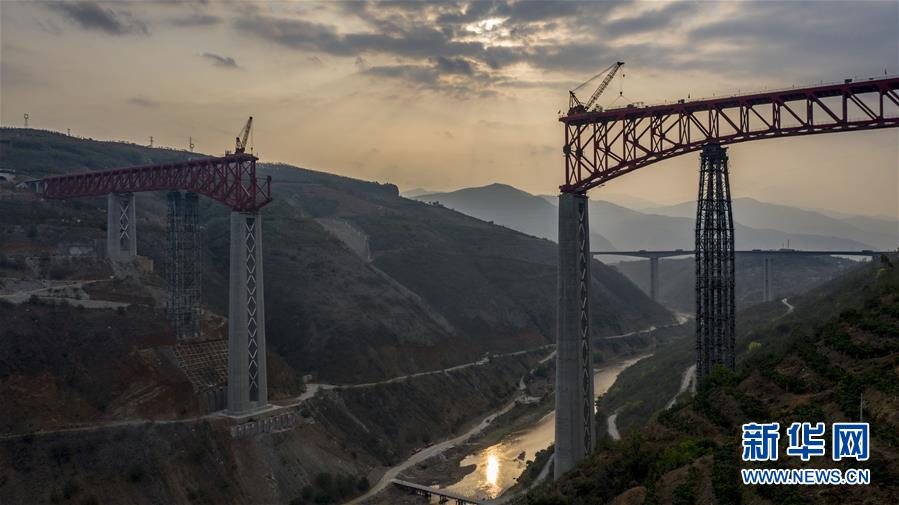 4月8日清晨,工人在中老鐵路元江特大橋上進行鋼桁梁架設(shè)作業(yè)(無人機照片)。4月7日,中老鐵路全線重點控制性工程——元江特大橋迎來關(guān)鍵節(jié)點,主橋鋼桁梁正式“邁”過154米高的主橋墩,這是世界同類鐵路橋梁第一高墩。元江特大橋位于云南省元江縣,采用上承式連續(xù)鋼桁梁跨越峽谷,全長832.2米,建成后,其249米的主跨也將刷新國內(nèi)同類橋梁跨度紀錄。新華社記者江文耀攝