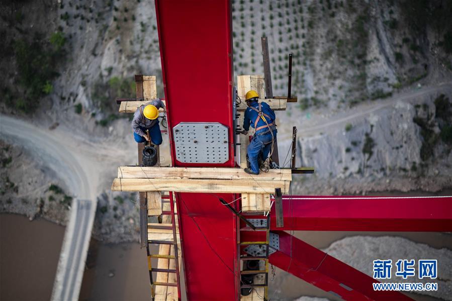 4月8日,中鐵四局的工人們進(jìn)行鋼桁梁架設(shè)作業(yè)。新華社記者江文耀攝