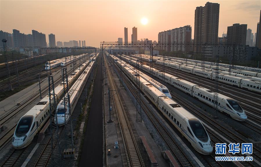 4月8日,在武漢動車段,列車??吭诖孳嚲€上準(zhǔn)備投入運行(無人機照片)。新華社記者肖藝九攝