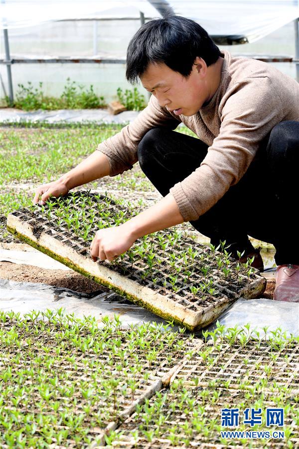 4月13日,在洛南縣麻坪鎮(zhèn)三興村辣上天育苗合作點,村民張紅在檢查育苗情況。新華社記者陶明攝