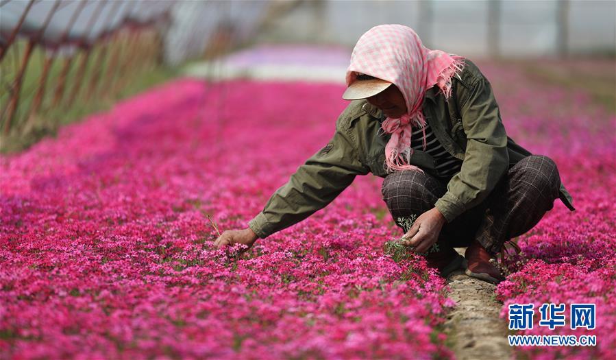 4月13日,在八角臺(tái)街道雅化村花圃?xún)?nèi),花農(nóng)為培育的宿根花卉除草。新華社記者姚劍鋒攝