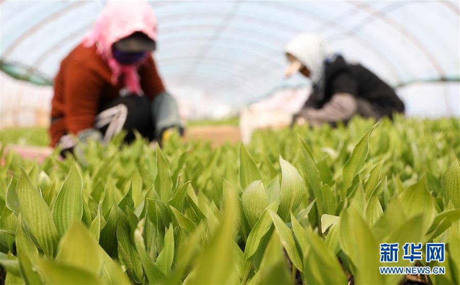 4月13日,在八角臺(tái)街道雅化村花圃?xún)?nèi),花農(nóng)為宿根花卉除草。新華社記者姚劍鋒攝
