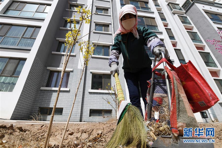 在古浪縣綠洲生態(tài)移民小城鎮(zhèn),胥存打掃小城鎮(zhèn)花園衛(wèi)生(4月7日攝)。新華社記者范培珅攝