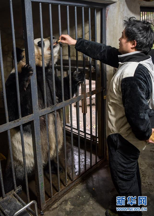 4月14日,中國(guó)大熊貓保護(hù)研究中心核桃坪基地飼養(yǎng)員周季秋用投喂窩窩頭的方法訓(xùn)練大熊貓“喜妹”。新華社記者張超群攝
