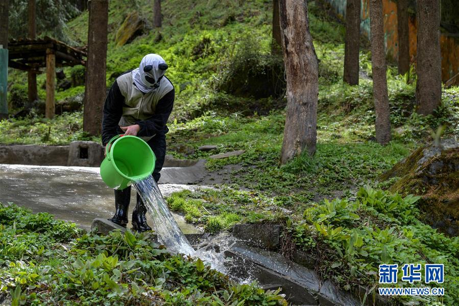 4月14日,中國(guó)大熊貓保護(hù)研究中心核桃坪基地的飼養(yǎng)員周季秋身著涂抹了稀釋后大熊貓尿液的“熊貓偽裝服”,在大熊貓活動(dòng)場(chǎng)內(nèi)打掃衛(wèi)生。新華社記者張超群攝