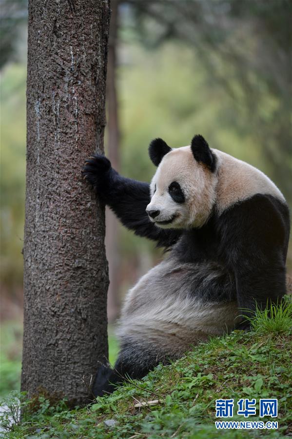 4月14日,大熊貓“喜妹”在中國(guó)大熊貓保護(hù)研究中心核桃坪基地活動(dòng)場(chǎng)內(nèi)。新華社記者張超群攝