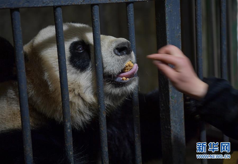 4月14日,中國(guó)大熊貓保護(hù)研究中心核桃坪基地飼養(yǎng)員周季秋用投喂窩窩頭的方法訓(xùn)練大熊貓“喜妹”。新華社記者張超群攝