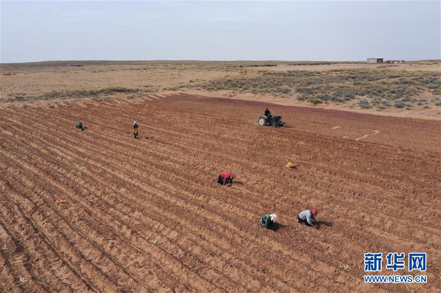 4月15日,農(nóng)民在杭錦旗道勞呼都格嘎查的農(nóng)田里勞作(無人機(jī)照片)。春種時(shí)節(jié),在內(nèi)蒙古鄂爾多斯市杭錦旗道勞呼都格嘎查,農(nóng)民忙著播種紅蔥。在鄂爾多斯高原種植的紅蔥耐旱耐寒,具有較好的經(jīng)濟(jì)效益。新華社記者徐欽攝