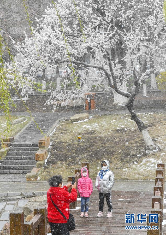 4月21日,在長春市杏花村公園,市民在雪中拍照留念。當(dāng)日,吉林省多地迎來降雪天氣。新華社記者許暢攝