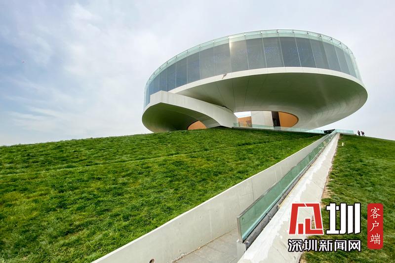 2020年4月21日,河南省鄭州市,北龍湖畔出現(xiàn)了一座巨大的圓環(huán)狀建筑,又酷似一頂圓型王冠,建筑周邊的斜坡草坪呈金字塔狀,圓環(huán)建筑仿佛“懸浮”在空中,造型別致。這座建筑是鄭州鄭東新區(qū)龍湖公共藝術(shù)中心。