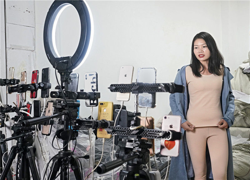 2019年11月9日,浙江金華,義烏北下朱村,女主播在直播銷(xiāo)售保暖內(nèi)衣。