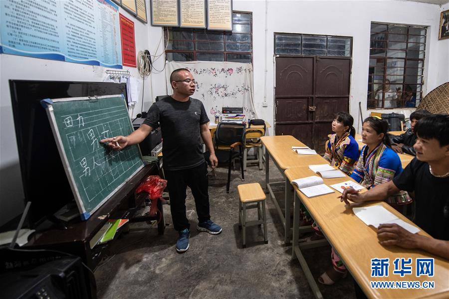 4月10日,在云南省勐??h布朗山鄉(xiāng)曼囡村曼班三隊,娜四(左二)在村里上夜校。新華社記者胡超攝