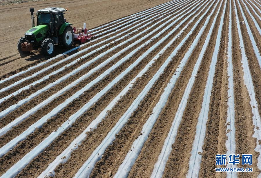 4月25日,灤南縣東黃坨鎮(zhèn)新戶村農(nóng)民使用拖拉機(jī)給準(zhǔn)備栽植煙薯秧苗的土地開溝覆膜(無人機(jī)照片)。近年來,河北省灤南縣利用當(dāng)?shù)赝寥篮蜌夂蛱攸c(diǎn),引導(dǎo)農(nóng)民因地制宜發(fā)展煙薯種植,取得良好效果。目前該縣煙薯種植面積達(dá)3萬多畝,每畝年收入達(dá)5000多元。新華社記者楊世堯攝