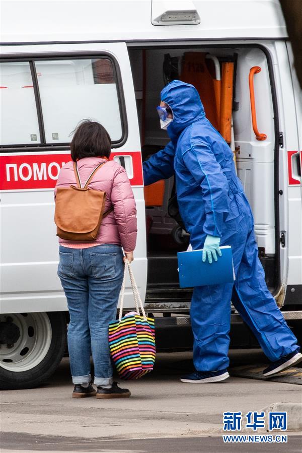 4月27日,在俄羅斯首都莫斯科,醫(yī)護人員(右)引導一名女子走上救護車。據(jù)俄羅斯防疫指揮部27日消息,過去24小時俄新增新冠肺炎確診病例6198例,累計確診87147例,單日增幅7.66%。新華社記者白雪騏攝