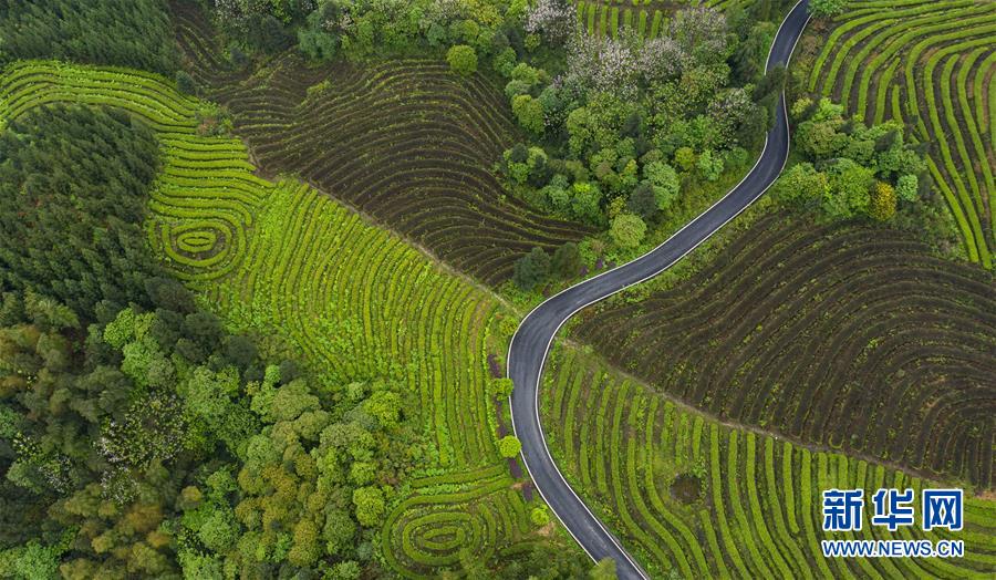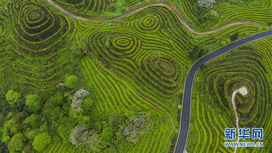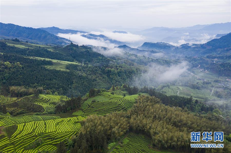 俯瞰鹿鳴茶海一角(4月28日無人機(jī)照片)。四川省珙縣的鹿鳴茶海,常年云霧繚繞,茶壟依山分布,美不勝收。新華社記者江宏景攝