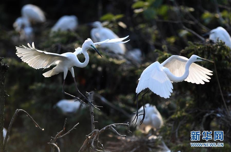 白鷺在位于鄱陽湖畔的南昌市象山森林公園內棲息(4月27日攝)。近日,在江西省南昌市新建區(qū)象山森林公園內,已安家筑巢的大批白鷺進入繁殖旺季。在夕陽的照耀下,白鷺時而翩翩起舞,時而展翅盤旋,構成一幅美麗的自然生態(tài)畫卷。新華社記者萬象攝