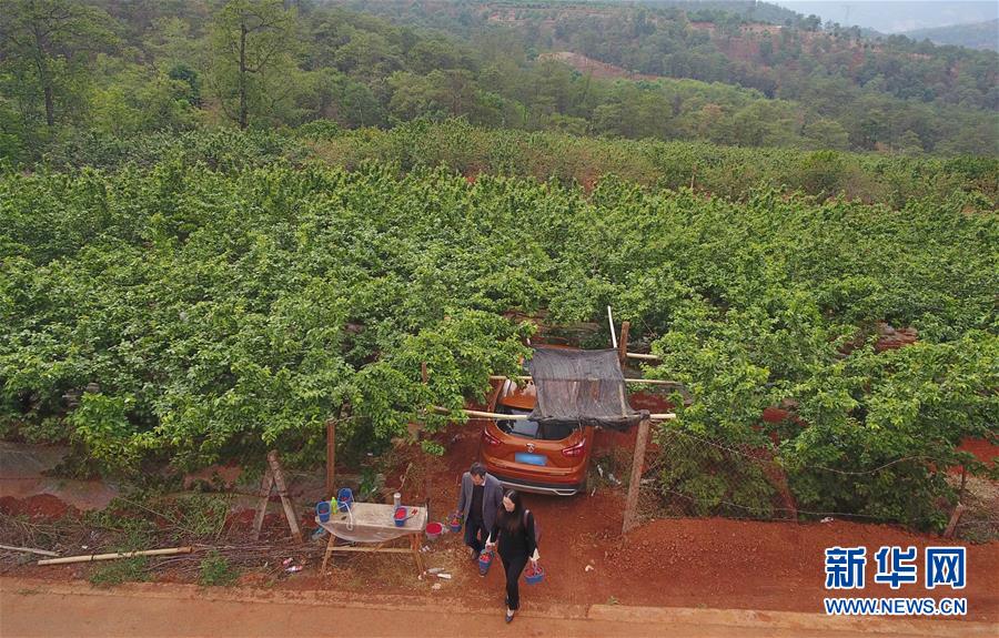 4月28日,游客從云南省富民縣赤鷲鎮(zhèn)普橋村櫻桃園走出(無人機(jī)照片)。云南省富民縣赤鷲鎮(zhèn)大力發(fā)展特色種植業(yè),全鎮(zhèn)種植櫻桃4000余畝,幫助當(dāng)?shù)剞r(nóng)民增收致富。新華社記者楊宗友攝