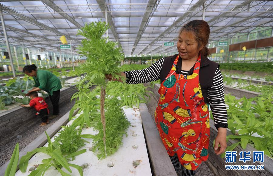 4月29日,珙縣三合村的村民在現代農業(yè)產業(yè)示范園區(qū)收獲無土栽培的蔬菜苦菊。新華社記者江宏景攝