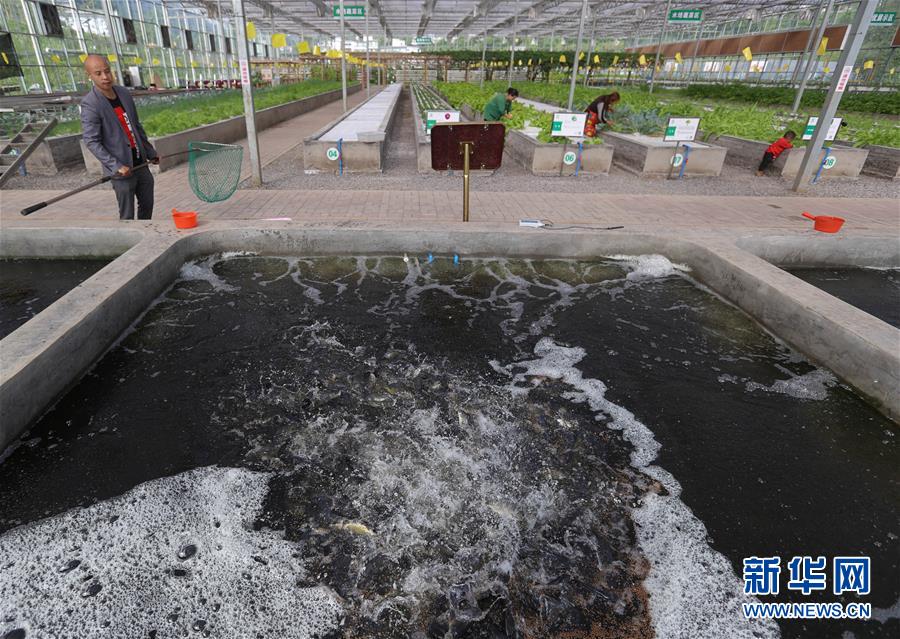 4月29日,在珙縣三合村現(xiàn)代農(nóng)業(yè)產(chǎn)業(yè)示范園區(qū),魚塘的廢水接入無土栽培蔬菜棚中進行養(yǎng)種循環(huán)利用。新華社記者江宏景攝