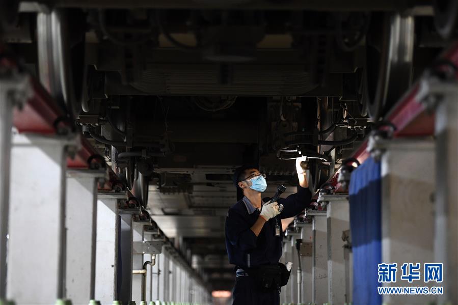 4月29日夜,合肥南動(dòng)車(chē)運(yùn)用所的工作人員對(duì)動(dòng)車(chē)組進(jìn)行檢修。每當(dāng)夜深人靜的時(shí)候,合肥南動(dòng)車(chē)運(yùn)用所卻燈火通明,“動(dòng)車(chē)安全守護(hù)者”們堅(jiān)守崗位,對(duì)動(dòng)車(chē)組進(jìn)行全面細(xì)致檢修。新華社記者 劉軍喜 攝