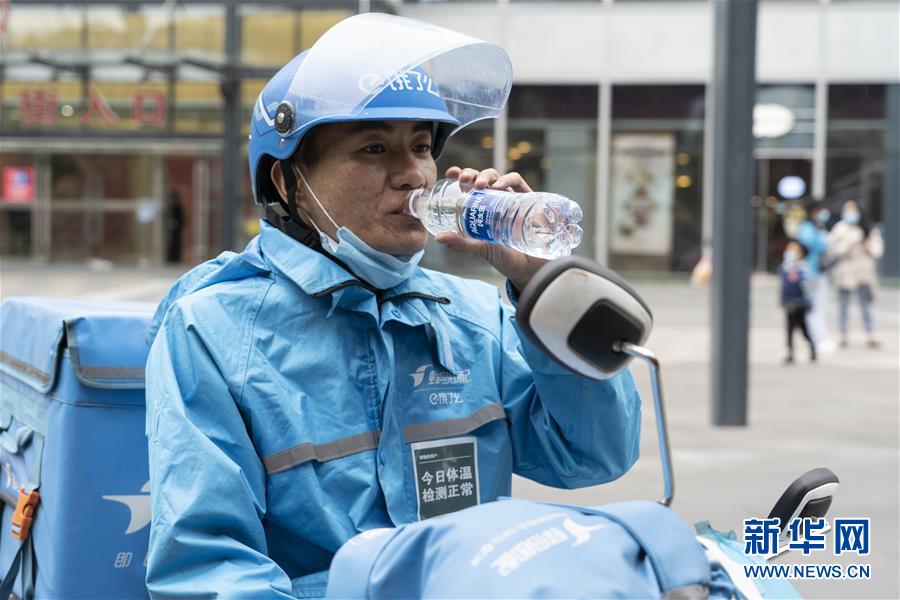 4月22日,在四川省成都市一家商場(chǎng)門(mén)前,邱有哈子在送餐間隙喝水休息。新華社記者 李夢(mèng)馨 攝