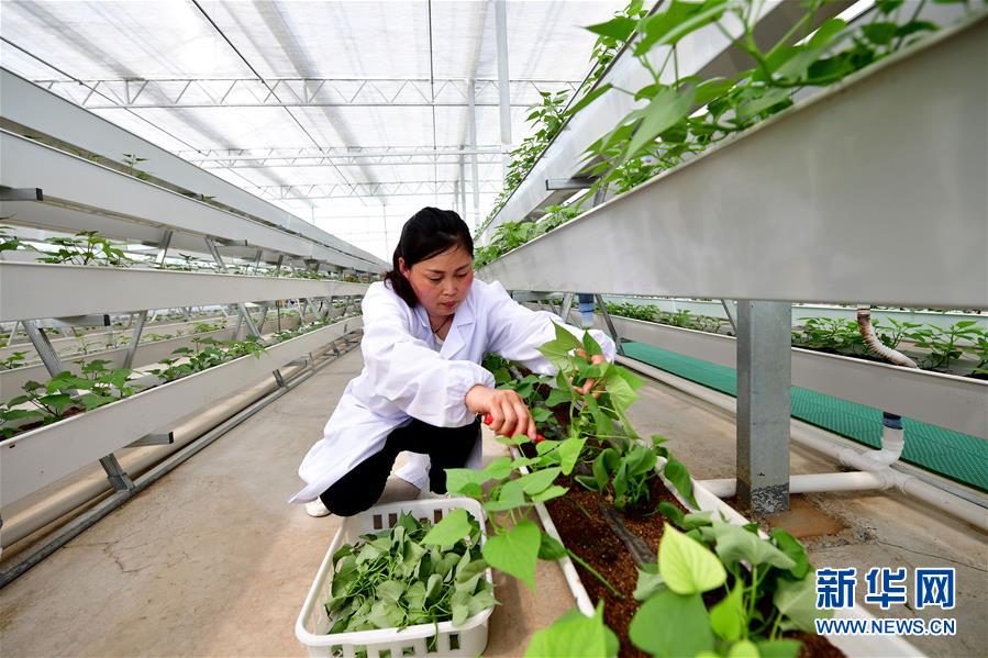 5月1日,村民在河南省鶴壁市淇濱區(qū)鉅橋鎮(zhèn)崗坡村飲馬泉甘薯脫毒快繁中心里剪苗。  新華社記者馮大鵬攝