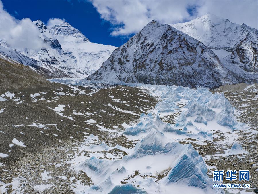 位于珠穆朗瑪峰腳下海拔5400米左右的中絨布冰川(4月30日攝,無(wú)人機(jī)照片)。位于珠穆朗瑪峰腳下海拔5400米左右的中絨布冰川,巍峨壯觀,冰塔林托起世界最高峰,讓人嘆為觀止。新華社記者普布扎西攝