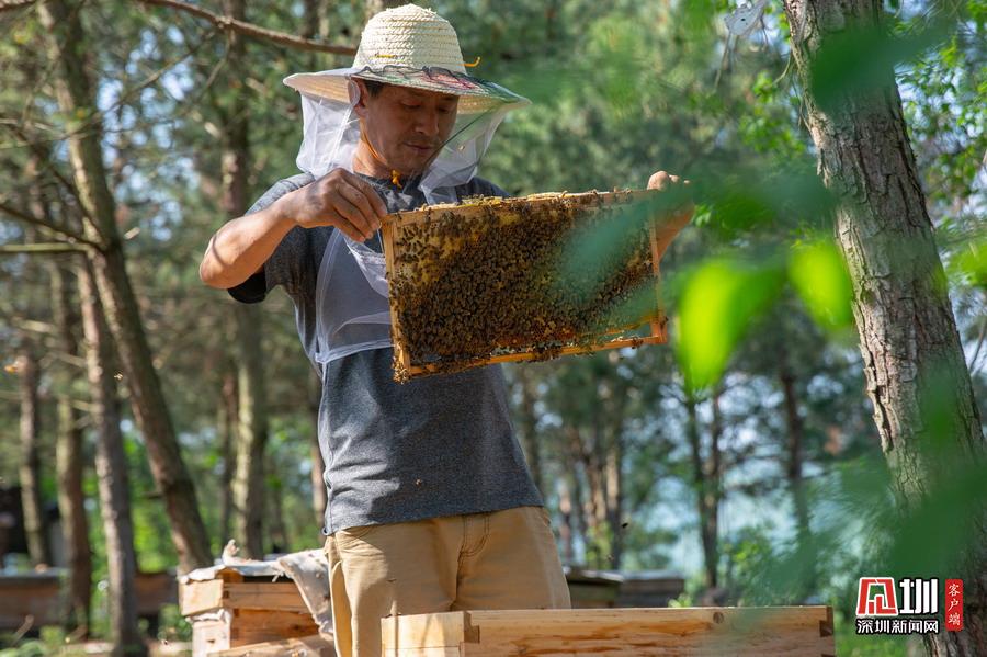 2020年5月3日,湖北省襄陽市,在南漳三道河水庫小島上,小島養(yǎng)蜂人趙德海每天要巡視蜂箱,查看蜂箱的蜜蜂密集度和蜜蜂繁殖情況,及時調(diào)整,才能避免蜜蜂受損。